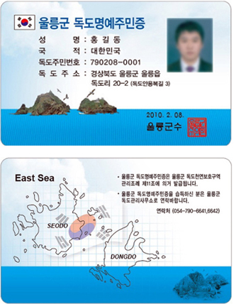 독도 방문객을 대상으로 온라인으로 관리가 가능한 "독도 명예주민증"을 발급함으로써, 독도의 위상강화 및 애국심 고취시키고자 독도명예주민증을 발급합니다.
